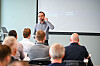 Steffen Moe (Sparebanken Møre) holdt innlegg om bankene sin rolle innen bygg og anleggsbransjen og hvordan de jobber for å kunne hjelpe bransjen videre.