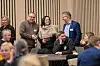 Statsforvalter Else-May Botten i samtale med ordfører Hugo Pedersen i Surnadal (til venstre) og ordfører Svein Roksvåg i Smøla (til høyre) under samlingen på Normoria i Kristiansund.