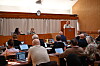 Høyres Torbjørn Sagen på talerstolen (til høyre), med (f.v.) fungerende ordfører Berit Tønnesen og bysekretær Kristin Heggelund på podiet.
